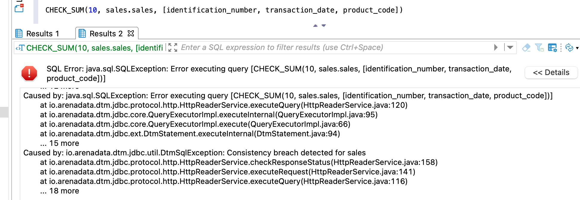 Контрольная сумма рассчитывается пошагово: по логической таблице и затем, если требуется, по всей логической базе данных. Полученные значения сравниваются между целевыми СУБД. Если контрольные суммы на каком-либо из шагов не совпадают в разных СУБД, в ответе возвращается исключение Consistency breach detected for <entity_name>. Подробнее об алгоритмах расчета контрольных сумм см. ниже.
